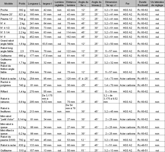| Le tableau ci-dessous vous permettra de comparer les principales caractéristiques de la gamme des rabots Veritas. |