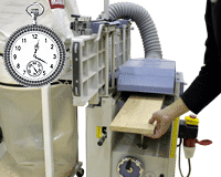 Test n°3 - Essais en vraie grandeur sur rabot-dégauchisseuse Holztech FS 320 avec tuyau d'aspiration standard (Ø 100 mm, longueur 2 m). Utilisation d'un bois de densité moyenne. Épaisseur rabotée : 1 mm sur une largeur de 200, 260, 310 mm. Vitesse d'avance : 6, 5 m/min. Vérification du volume de copeaux produit et aspiré dans ces configurations optimales.