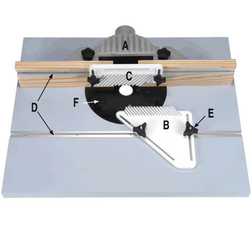 - Peigne large (B) : à fixer sur la table. Régable en profondeur, il presse les pièces contre les guides latéraux.