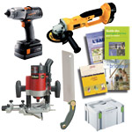 Les lots : Perceuse-visseuse à chocs Protool QuaDrive - Meuleuse Dewalt DC411KB - Défonceuse Perles OF9 Electronique - Lot de 4 livres bricolage et énergies vertes - Systainer Festool n° 3 vide - Scie japonaise débit 300 mm.