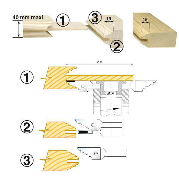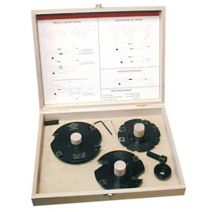 Voici un coffret de 3 outils spécialement conçu pour réaliser des assemblages à profils et contre-profils en simple ou double parement (moulures sur une ou deux faces d'un ouvrage) et en deux avancements de 15 ou 19 mm (l'avancement correspond à la largeur de la moulure).