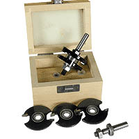 Coffret de 5 disques pour rainurage sur chant, feuillure et réalisation de languette en une passe grâce à un deuxième arbre rallongé livré en supplément.