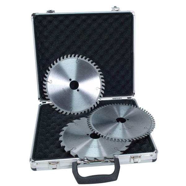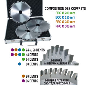 Les lames de nos quatre coffrets sont de dimensions standard sur la plupart des combinées du marché : diamètre 200, 250 ou 300 mm et alésage 30 mm. Chaque coffret comprend trois modèles de lames différents :