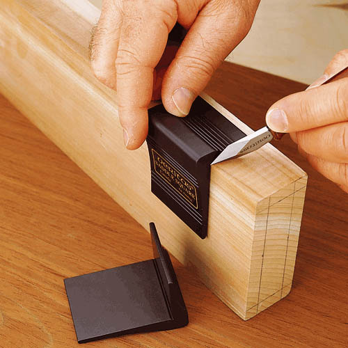 Transférer une ligne de la face d'une pièce sur une autre face perpendiculaire n'est jamais très facile avec une équerre normale : reportez l'épaulement d'un tenon sur les 4 faces d'un montant et vérifiez, vous remarquerez qu'il y a souvent un décalage. Ce décalage est la plupart du temps dû à un défaut de positionnement de l'équerre sur la pièce de bois lors du traçage.