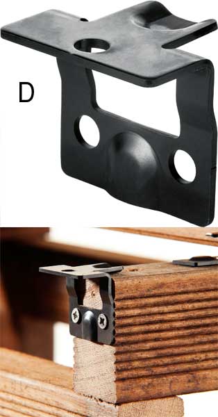 D - Griffe d'angle : pour la fixation sûre de planches de bordure ou de marches d'escalier avec un interstice constant de 4 mm. Vendues par boîtes de 20 griffes.