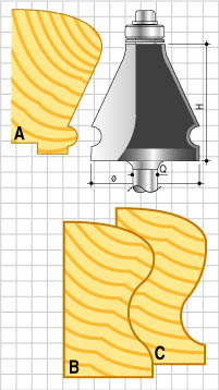 L'arrondi supérieur de la rampe sera réalisé à l'aide d'une fraise à moulure large type "Bec de corbin" (repère D sur le schéma ci-contre).