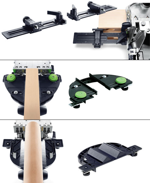 - Paire de butées latérales : pour la pose successive de plusieurs Dominos juxtaposés, par exemple pour le montage de caissons. Chaque mortaise réalisée devient repère de positionnement et appui pour réaliser la suivante. Il n'y a donc besoin d'aucun traçage préalable sur les bois à assembler, d'où un gain de temps et de précision.