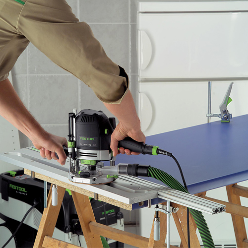 Il s'utilise avec une bague de copiage de 30 mm et une fraise droite de 14 mm (disponible en option). Sa fixation se fait à l'aide des serre-joints Festool à vis ou à levier (proposés en option).