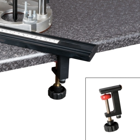 - Paire de serre-joints orientables de capacité 51 mm. Particulièrement polyvalents, ils glissent sous le rail avec friction douce réglable. Ne gênent pas le passage de la défonceuse et permettent une fixation non parallèle au bord de la pièce.