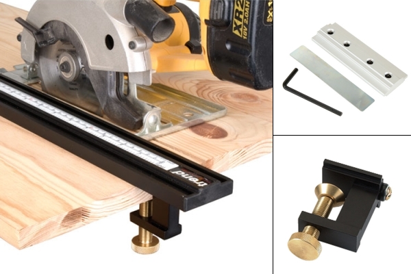 - Système de guidage angulaire avec rail de 915 mm. Il se fixe sur le rebord de la pièce avec 2 serre-joints et la fixation sera renforcée par un troisième serre-joint en bout de rail. Très précis et réglable de 25° à 155°. Cranté aux 7 angles habituels.