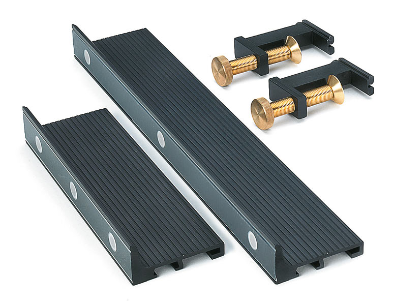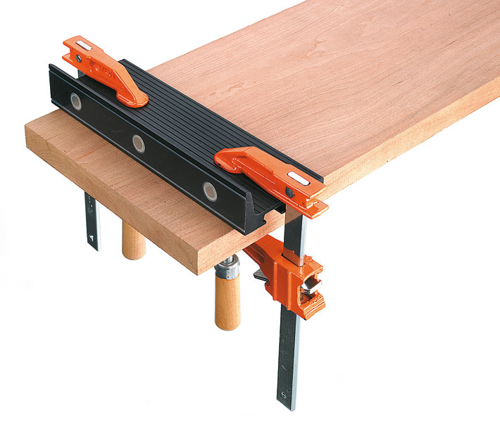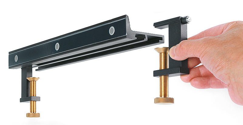 Pour effectuer les plus petites découpes, le guide peut facilement se maintenir à la main sans risque de bouger (car sa sous-face est munie de deux bandes antidérapantes). Il est aussi possible de le fixer à l'aide de deux serre-joints classiques. Enfin, la paire de serre-joints Veritas (en option) offre l'avantage d'être très discrète : les "têtes" des serre-joints coulissent dans la rainure située sous le guide de sciage et son positionnement est ainsi possible quelle que soit la largeur de la pièce, et cela sans gêner le passage de la scie. Leur capacité de serrage est de 50 mm.