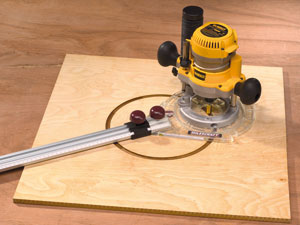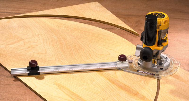 Il sera très utile pour remplacer un guide parallèle de défonceuse (qui est généralement très limité en capacité de largeur). Ce guide permet les usinages parallèles très loin du bord, jusqu'à 787 mm ! Ses deux joues métalliques sont percées afin de pouvoir y fixer un guide continu (il suffit alors d'y visser un simple tasseau rectiligne). De plus, muni de sa pointe de centrage, il permet de facilement découper ou défoncer des cercles à la défonceuse (rayon de 130 à 680 mm maxi).