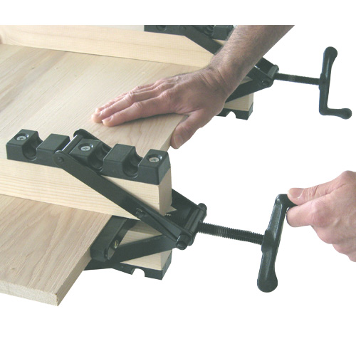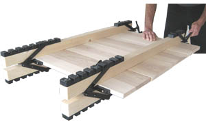 Ce kit est prévu pour fabriquer vous-même, très simplement et à vos mesures, une astucieuse presse à panneau. Cette presse permet d'effectuer très confortablement et efficacement du panneautage*, qu'il soit à plats joints ou à assemblages usinés. En effet, exerçant une pression simultanée dans les quatre directions (dans l'axe du serrage puis verticalement, vers le haut et vers le bas), elle anéantit tous risques de déformation du panneau (son cintrage tant redouté pendant le serrage..) et les joints s'alignent automatiquement.