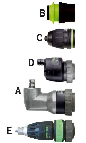 Tous les mandrins de cette page se montent sur les perceuses visseuses sans fil Festool avec interface FastFix : C 12 - TDK - CDD FX - TDD FX.