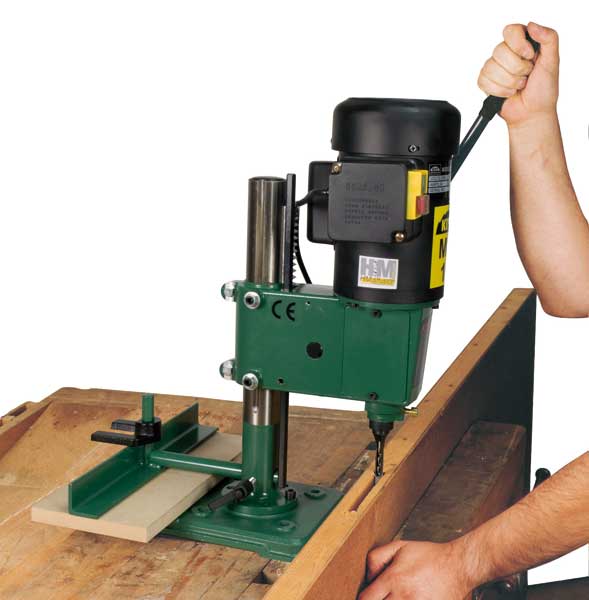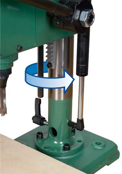 - Un vérin à gaz compensant le poids de la tête de mortaisage et permettant un contrôle précis de ses mouvements.