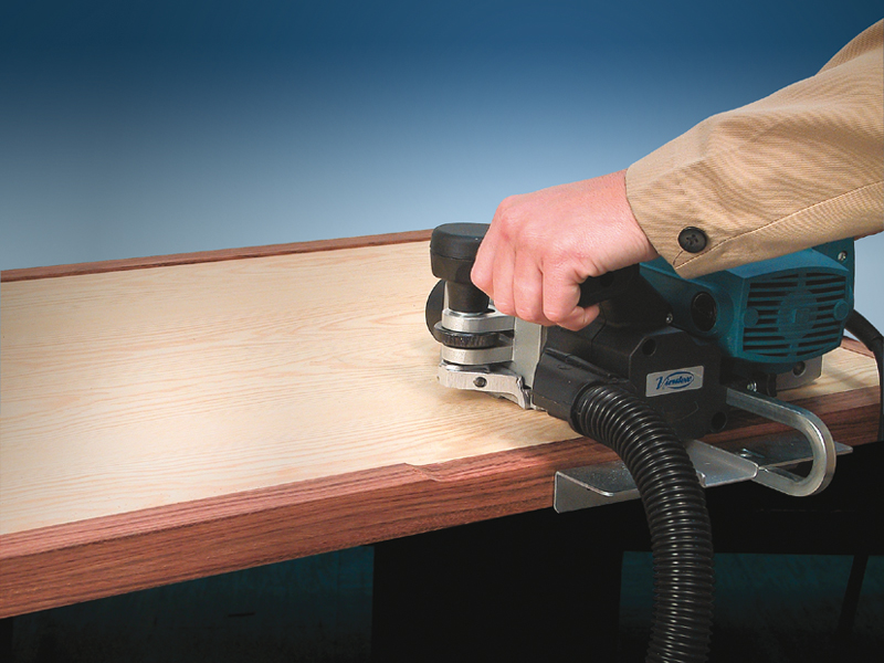 Rabot pour l'arasage des alaises sur chant dans la fabrication des meubles et l'agencement. Dispose d'une large surface d'appui pour travailler avec plus de stabilité et de sécurité. Base d'appui facilement réglable en hauteur par rapport au plan de coupe du porte-couteaux et traitée d'un recouvrement spécial permettant le glissement sans risque d'endommager la surface d'appui. Sa puissance (1300 W) permet de travailler sans aucun risque de fatigue mécanique. Équipé de couteaux réversibles au carbure 55 x 5,5 x 1,1 mm et d'une buse d'aspiration.