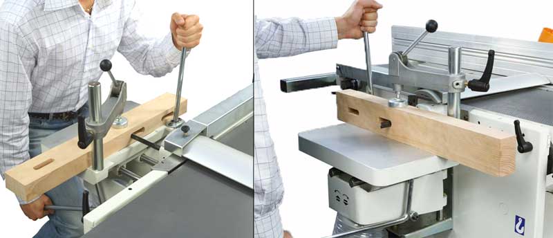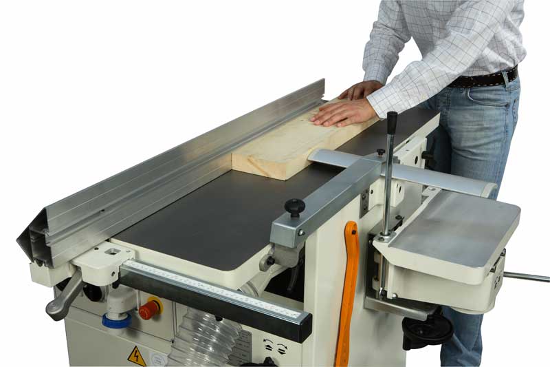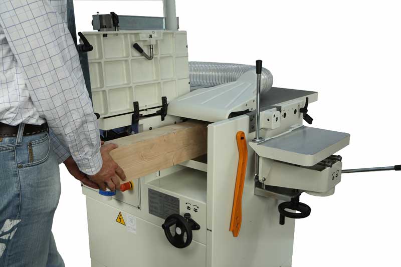 Grâce à un système d'entraînement remarquablement efficace (rouleau d'entraînement à denture hélicoïdale, rare sur les machines de ce type), il est possible de raboter des bois jusqu'à 200 mm de hauteur sans sourciller avec des usinages réguliers et sans à-coup du bois. Table de rabotage en fonte montée sur robuste fût central à crémaillère (réglage plus facile et rapide qu'un système sur tiges filetées). La table d'entrée de dégauchissage relevable vers l'arrière facilite largement les opérations de rabotage (récupération des bois en sortie). Raboteuse munie d'un levier de débrayage.