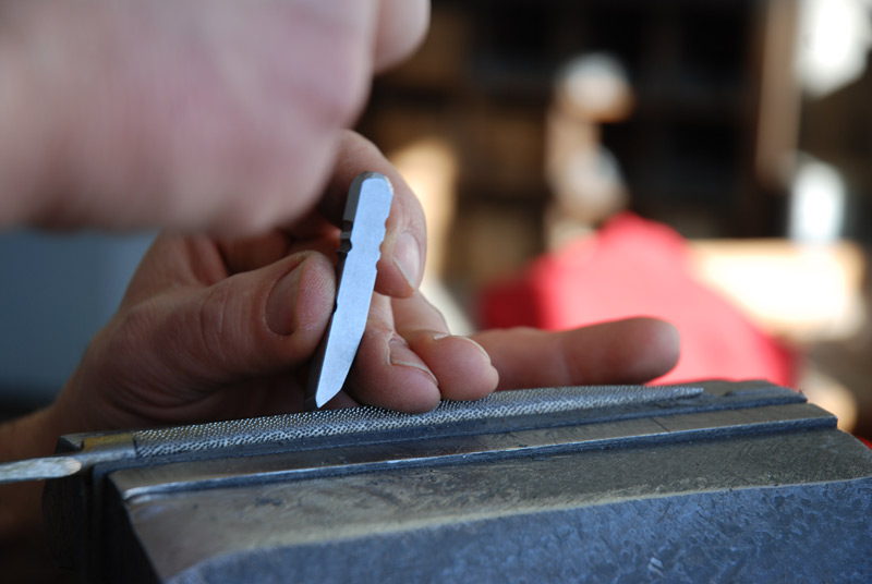 Sur l'ébauche réalisée en acier Y1 35 forgée puis travaillée individuellement, le piqueur forme chaque dent, en frappant à l'aide d'un poinçon et d'un marteau. Une grande maîtrise dans la pression de frappe détermine la taille de la denture. La répartition des coups est d'une extrême régularité. La râpe est enfin trempée à 820° à l'eau pour atteindre une dureté de 60 Rockwell en surface.