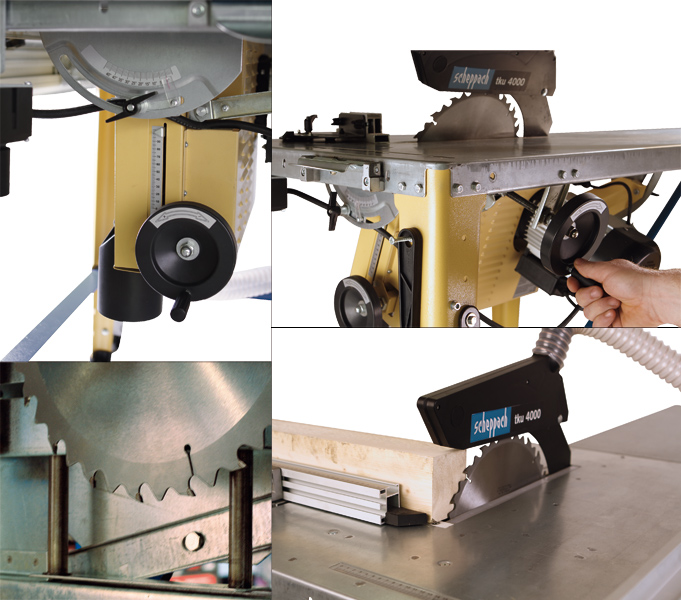 - Réglage de hauteur et de l'angle de sciage pratique et précis, à l'aide de deux volants indépendants. Des graduations permettent de lire aisément la hauteur et l'inclinaison en cours de réglage.