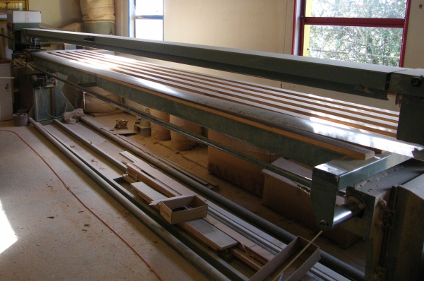Vend ponceuse longue bande Samco modèle LLT de 1981, 4,1 KW en 380V, longueur de table 5m00, montée et descente électrique, vendu avec lot de bandes grain 80, 120, 150.