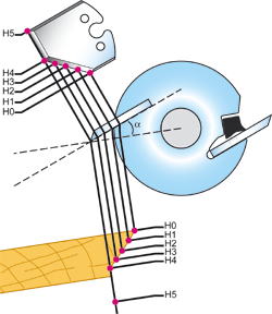 - Si pour les fers "à l'arbre", la moulure est la copie conforme du dessin du fer car l'outil est fixé perpendiculairement à l'axe de toupie. Il n'en va pas de même pour les fers se montant sur les porte-outils. Ceux-ci sont en effet monté sur le corps du porte-outil avec un certain angle d'attaque (repère "&") . Il en résulte donc une déformation de l'usinage par rapport au tracé du fer (Voir la projection ci-contre).