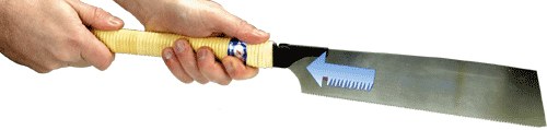 Pour les sciages fins, on peut utiliser la scie à une main en plaquant la longueur du manche contre son avant-bras. L'outil fait alors véritablement corps avec le scieur ! |