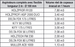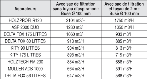 Test n°2 - Mesure du temps nécessaire pour aspirer et évacuer 75 litres de copeaux et poussières mélangés avec un tuyau standard (diamètre 100 mm, longueur 2 mètres). Trois essais successifs permettent de prendre en compte la perte de charge due au colmatage des filtres. Résultats exprimés en volumes de copeaux réellement aspirés en 1 heure ( m3/h).