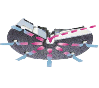 Patins de ponçage en MPE (type d'élastomère souple et résistant aux déchirures) quasiment indestructibles. Ils se changent sans outil. Pour limiter l'usure en périphérie des plateaux, le revêtement Velcro n'atteint pas tout à fait les bords.